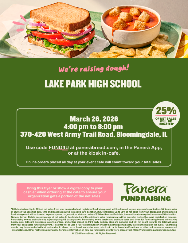 Join us on Thursday, March 26, 2026, from 4:00–8:00 PM at Panera Bread, 370–420 West Army Trail Road in Bloomingdale for a fundraiser that supports our choir students.